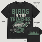 Rep your city with pride. This distressed Philly skyline back print brings the heart of Philadelphia to your game day fit. Designed in bold Eagles-inspired green, it’s perfect for pairing with our Birds in the Trenches front design or rocking solo on your favorite tee or hoodie. High-resolution PNG with transparent background for clean, pro-level printing.